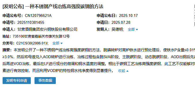 2025年10月17日,甘肅酒鋼集團宏興鋼鐵股份有限公司成功申請一項名為“一種不銹鋼產線冶煉高強度碳鋼的方法”專利,申請公布號為CN120796621A,申請日期為2025年7月28日。